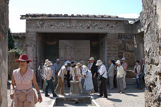 | ポンペイ ナポリに夜遅く着き、まずは一泊、次の日はポンペイ見物だ。 ポンペイはローマと同じくらい古く、紀元前800年ぐらいから栄えて いたが、紀元前89年には完全にローマの支配下になった。 紀元62年に大地震で大被害を受け、復興を果たした紀元79年に ベスビオ山が大爆発を起こし、街は火山灰に埋もれてしまった。 その後、1860年になってようやく組織的に発掘され始めたという。 |