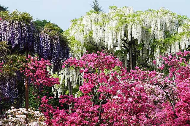 | 2005年5月9日藤で有名な栃木県あしかがフラワーパークへ出かけました。 ゴールデンウイークは終わったものの、高速を降りてパークへ曲がる交差点で 1時間渋滞するなど、まだまだかなりの混雑ぶりでした。 260本もの藤は大藤(紫)、白藤、八重藤が見ごろで黄藤が咲き始めたところ、 つつじ、クレマチス、ぼたんなども園内のここかしこに咲いていました。 |