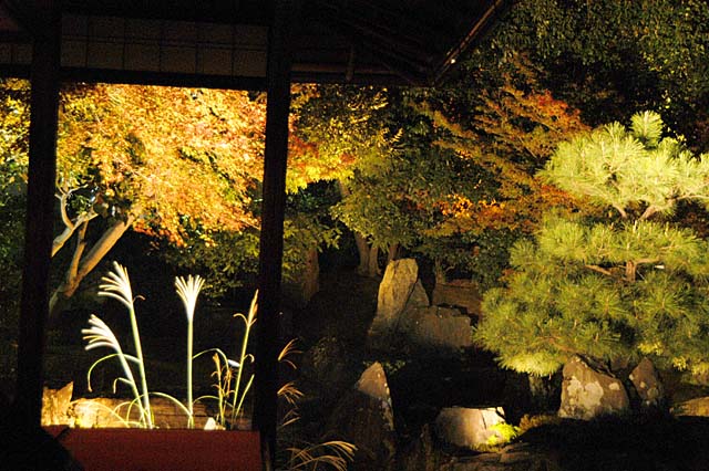 高台寺臥龍池のライトアップ、水面が鏡のように樹影を写す