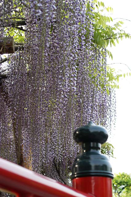 Wisterias in Kameido-tenjin shrine 亀戸天神の藤 2006年5月1日、藤で有名な亀戸天神に行ってきました。 昨年行った足利フラワーパーク(表紙写真・本文ページ)には 規模の大きさではかないませんが、23区内にあり、また朱塗りの 太鼓橋とよくマッチしており、ライトアップもなかなかきれいです。
