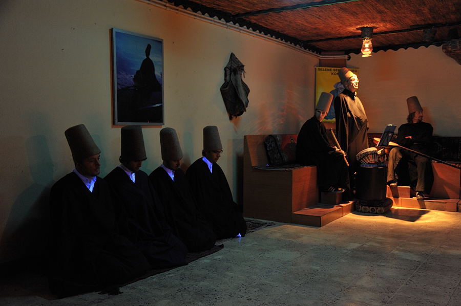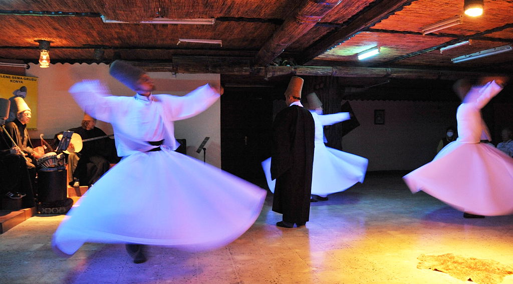 ぐるぐる回って祈る宗教儀式が始まる、3人の楽師が音楽を奏でる中、4人の踊り手が登場